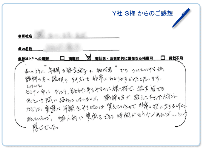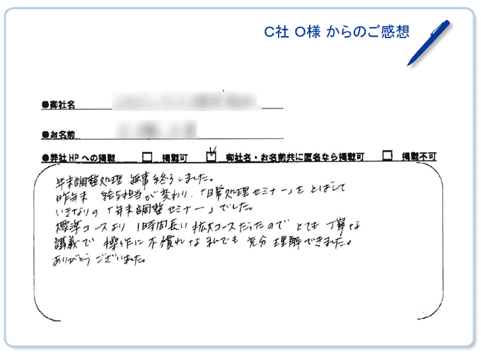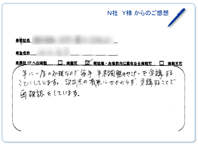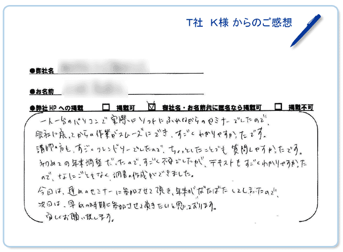 セミナー受講者からの声当社で過去に年末調整セミナーをご受講頂いた多くの皆様より、貴重なご意見・ご感想を頂戴しております。