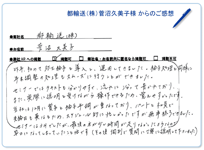 お客様の声: | 私のように "年調も弥生給与も初心者" でもついていける位、講師の方の説明もテキストも非常にわかりやすかったと思います。 とはいえセミナー中はやはり、言われた事をやるのに精一杯で、拡大版でもあっという間に終わってしまいましたが、講師の方が教えて下さったポイントなどは、実際に年調をやるときには覚えていたので非常に役に立ちました。 あえていえば、個人的に質問をできる時間がもう少しあればいいという感じでした。 Y社 S様 ご意見・ご感想原文はこちら |