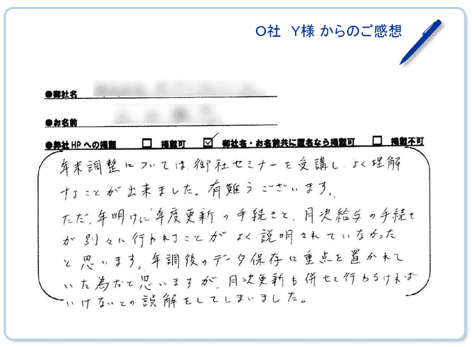 お客様の声: | 年末調整については、御社セミナーを受講し、よく理解することが出来ました。有難うございます。 ただ、年明けに年度更新の手続きと、月次給与の手続きが別々に行われることがよく説明されていなかったと思います。年調後のデータ保存に重点を置かれていた為だと思いますが、月次更新も併せて行わなければいけないとの誤解をしてしまいました F社 B様 ご意見・ご感想原文はこちら |