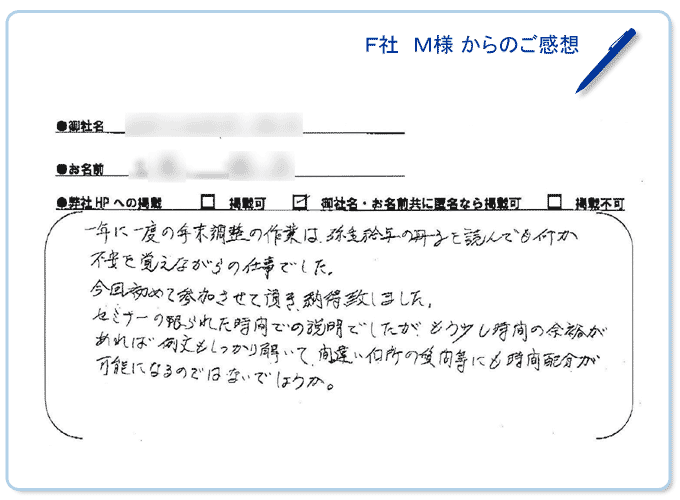 お客様の声: | 一年に一度の年末調整の作業は、弥生給与の冊子を読んでも何か不安を覚えながらの仕事でした。 今回初めて参加させて頂き、納得いたしました。 セミナーの限られた時間での説明でしたが、もう少し時間の余裕があれば例文もしっかり解いて、間違い個所の質問等にも時間配分が可能になるのではないでしょうか。 F社 M様 ご意見・ご感想原文はこちら |