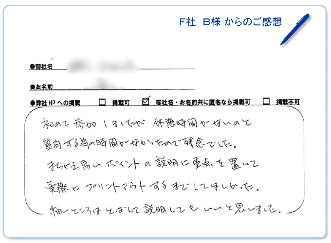 お客様の声: | 初めて参加しましたが休憩時間がないのと質問する為の時間がなかったので残念でした。 まちがえ易いポイントの説明に重点を置いて、実際にプリントアウトするまでしてほしかった。細かいところはとばして説明してもいいと思いました。 F社 B様 ご意見・ご感想原文はこちら |