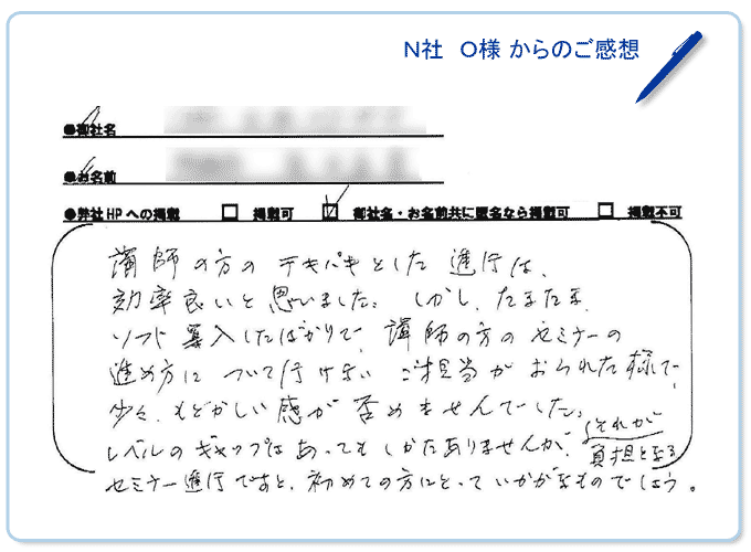お客様の声: | 講師の方のテキパキとした進行は、効率良いと思いました。しかし、たまたまソフト導入したばかりで、講師の方のセミナーの進め方について行けないご担当がおられた様で、少々、もどかしい感が否めませんでした。 レベルのギャップはあってもしかたありませんが、それが負担となるセミナー進行ですと、初めての方にとっていかがなものでしょう。 N社 O様 ご意見・ご感想原文はこちら |