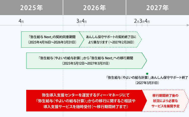 弥生株式会社で発表されている移行全体スケジュールに合わせ、弊社では移行に関するご相談や導入支援サービスのお申し込みを随時受け付けております。